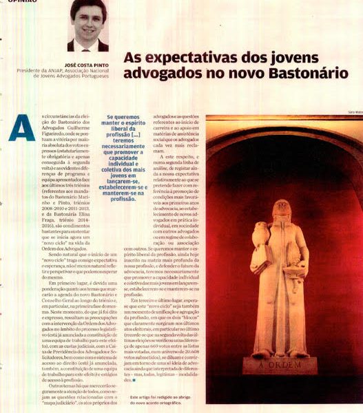 “Se queremos manter o espírito liberal da profissão […] teremos necessariamente que promover a capacidade individual e coletiva dos mais jovens em lançarem-se, estabelecerem-se e manterem-se na profissão.”, por José Costa Pinto (Presidente da Direção Nacional da ANJAP) ao Jornal de Negócios (19 de janeiro de 2017) sobre o “novo ciclo” na Ordem dos Advogados.